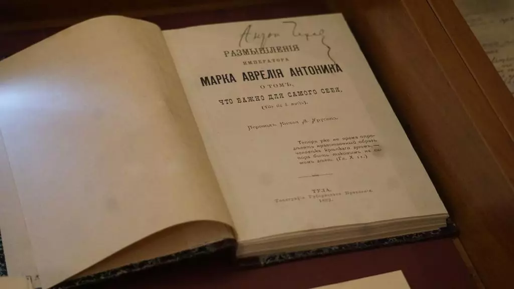 Еще один раздел «Русская классика» посвящен авторам, у которых Чехов учился мастерству. В витрине представлены одни из первых изданий сочинений Л.Н. Толстого (1886 г.), А.С. Пушкина (1887 г.) и И.С. Тургенева (1891 г.). Раздел «Поступления ялтинского периода» отражает время, когда Чехов сам стал признанным мэтром. Представлены сочинения М. Горького (1903 г.), интригующая рукопись неизвестного автора «Антихрист», а также «Общий каталог братьев Розен» (1904 г.) и «Каталог Таганрогской библиотеки» (1903 г.), который напоминает о том, как щедро Чехов пополнял фонды родного города, подарив библиотеке тысячи томов. Здесь же выставлена личная чернильница Антона Павловича.