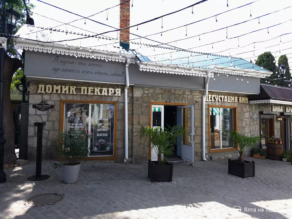 На главной пешеходной улице центра Алупки, рядом с музеем «История Алупки» и началом лестницы к улице имени Розы Люксембург есть один из курортных магазинчиков улицы Фрунзе — «Домик пекаря»: